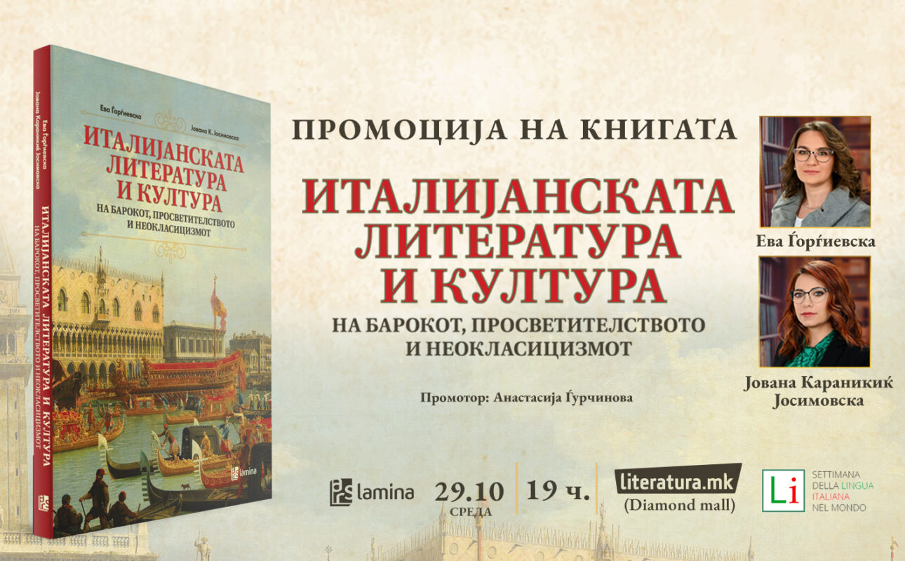 Новата книга „Италијанската литература и култура на барокот, просветителството и неокласицизмот“ од авторките проф. д-р Ева Ѓорѓиевска и проф. д-р Јована Караникиќ Јосимовска ќе биде промовирана на 29 октомври (среда), во 19 часот, во книжарницата „Литература.мк“ во „Дајмонд мол“.